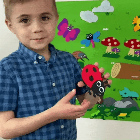 ¡El set incluye un fondo de fieltro de 100 x 75 cm, cuatro prácticos ganchos adhesivos para colgarlo en la pared y 33 lindas figuras!